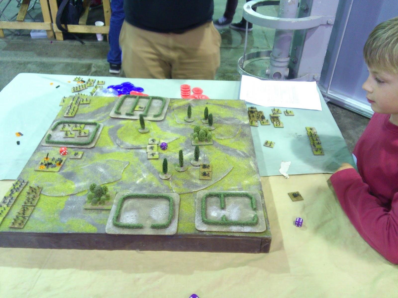 The first thing we did was peruse the many games going on to see what may take their fancy. Edward, who is only nine, had expressed a big interest in trying out some Fantasy games. However, after a brief wander he was adamant on having a go on a 6mm WW1 game that some fellow had set up on a small 2x2 tile! The man in charge was a lovely chap who was very patient with him despite an absolute barrage of questions. I then left father and son to get on with it for a while and roll some dice in their first ever Wargame together.